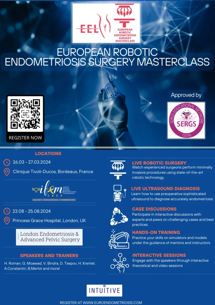 You are already doing robotic surgery on patients with endometriosis, but want to learn more about the advantages and challenges of robotic surgery? You ask yourself how to select the appropriate cases for robotic surgery and how to optimize the outcomes? You wonder how to perform complex procedures such as bowel resection or nerve-sparing techniques with the robot? You wish to implement robotic surgery for endometriosis in your centre or improve your existing program? These and more questions will be answered in the new European Endometriosis Robotic Masterclass created by the European Endometriosis League (EEL). The masterclasses will take place in the most innovative European centres for robotic surgery. With its combination of interactive workshops, presentations and live-surgeries, the masterclass offers the unique possibility to enhance your knowledge and skills in all aspects of robotic surgery for endometriosis in two days full of training, exchange and unforgettable experiences. The experts will share their tips and tricks on robotic surgery for endometriosis.